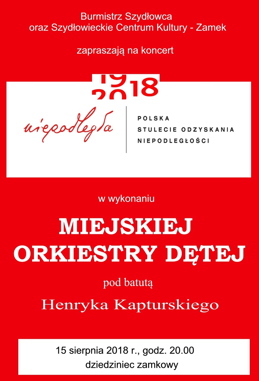 O godz. 20.00 na dziedzińcu zamkowym odbędzie się koncert pt. „NIEPODLEGŁA POLSKA – STULECIE ODZYSKANIA NIEPODLEGŁOŚCI” w wykonaniu Miejskiej Orkiestry Dętej pod batutą Henryka Kapturskiego.