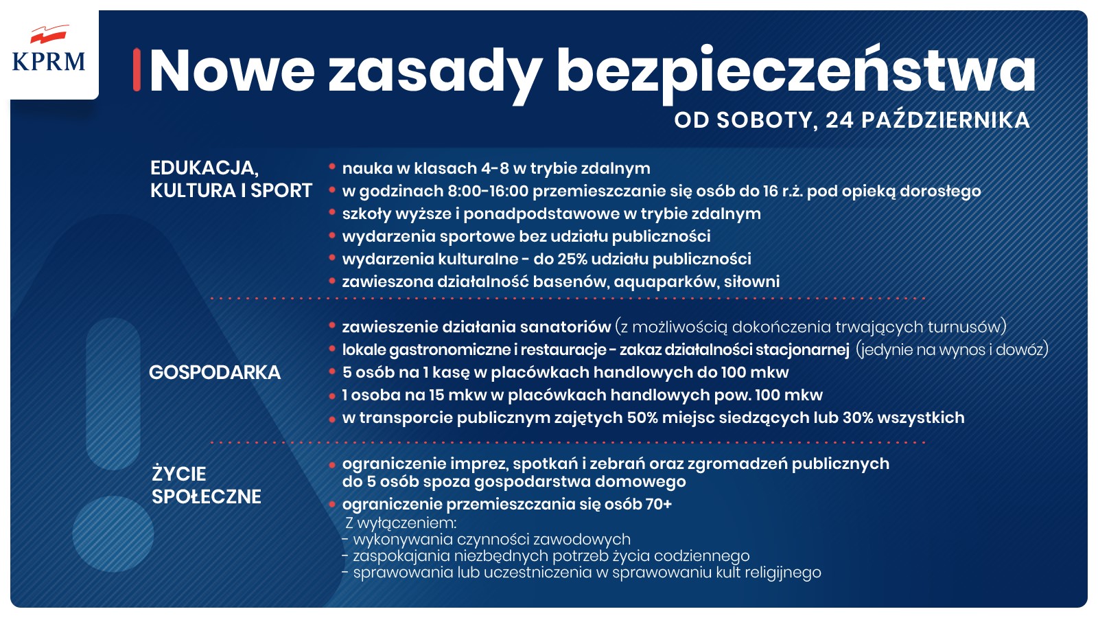 Cała Polska staje się czerwoną strefą, zamknięte zostają bary i restauracje, starsze roczniki szkół podstawowych przechodzą na naukę zdalną, a osoby do 16. roku życia nie mogą same wychodzić z domu przez część dnia – to niektóre z obostrzeń w walce z koronawirusem, o których poinformował w piątek 23 października na konferencji prasowej Mateusz Morawiecki. Nowe zasady wchodzą w życie w sobotę.