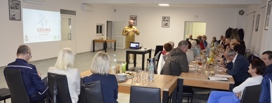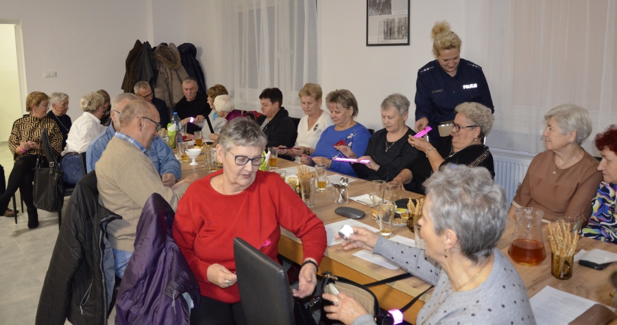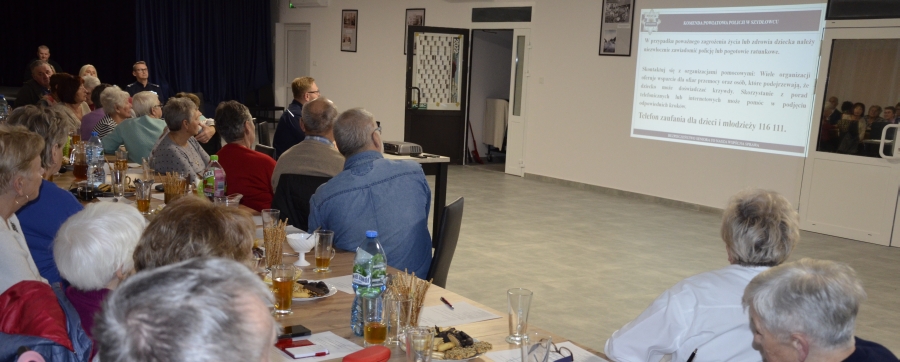 Naczelnik Wydziału Prewencji Komendy Powiatowej Policji w Szydłowcu przedstawił prezentację multimedialną i wyjaśnił zebranym sposób działania Krajowej Mapy Zagrożeń Bezpieczeństwa oraz aplikacji mobilnej Moja Komenda. Ponadto omówił działania prewencyjne oraz wymienił sposoby działania oszustów wobec seniorów, oraz przedstawił zasady jak się ich ustrzec i na co zwrócić uwagę w kontaktach z osobami nieznajomymi. Nawiązał także do trwającej ogólnopolskiej kampanii społecznej „Dzieciństwo bez Przemocy“, aby uwrażliwić na problem krzywdzenia dzieci. Wyjaśnił jakie zachowania mogą świadczyć o przemocy i gdzie należy niezwłocznie zgłaszać niepokojące nas sytuacje.