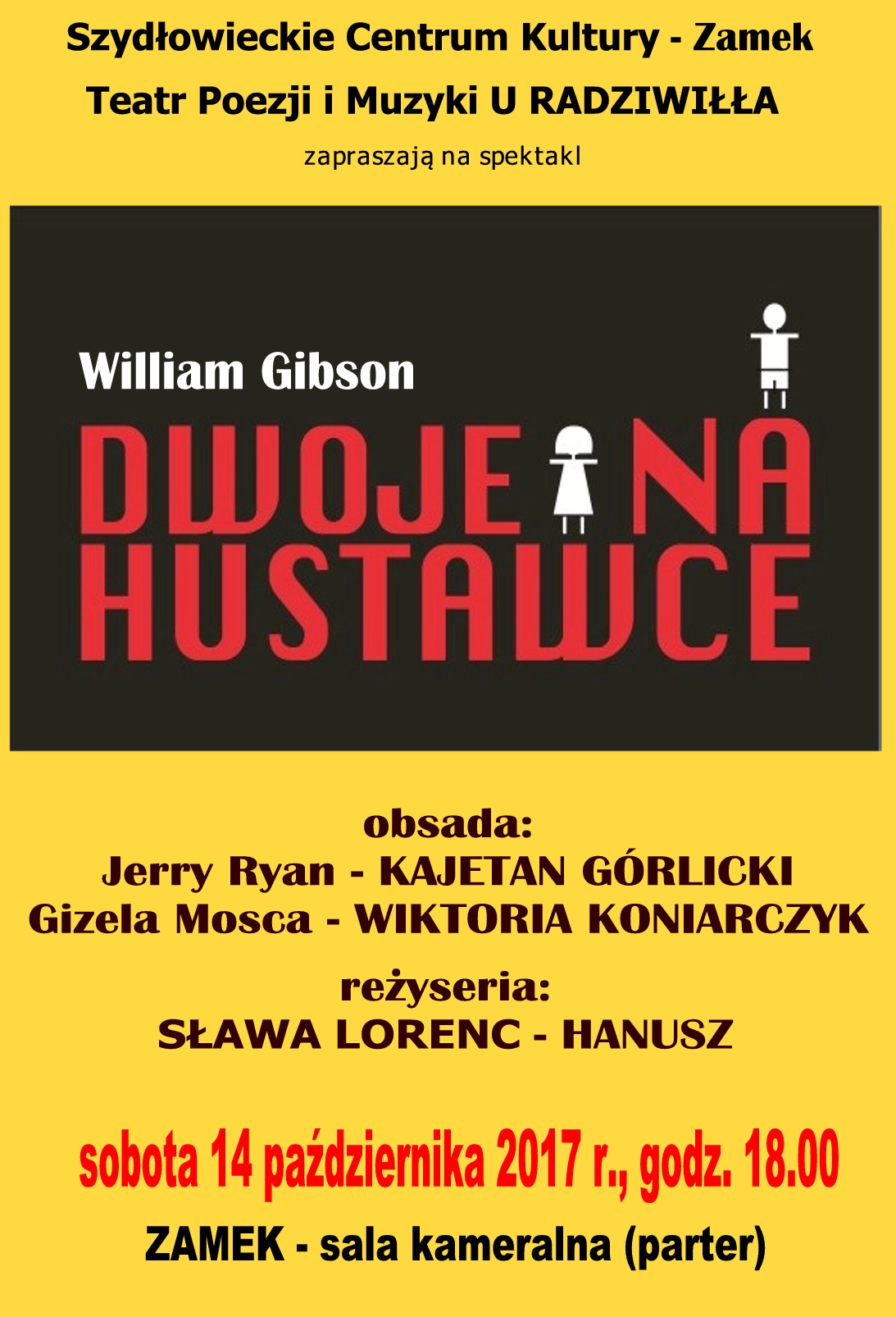 Szydłowieckie Centrum Kultury – Zamek serdecznie zaprasza w sobotę 14.10.2017 o godzinie 18:00 na spektakl autorstwa Williama Gibsona pt. „DWOJE NA HUŚTAWCE” w wykonaniu Teatru Poezji i Muzyki „U Radziwiłła”.