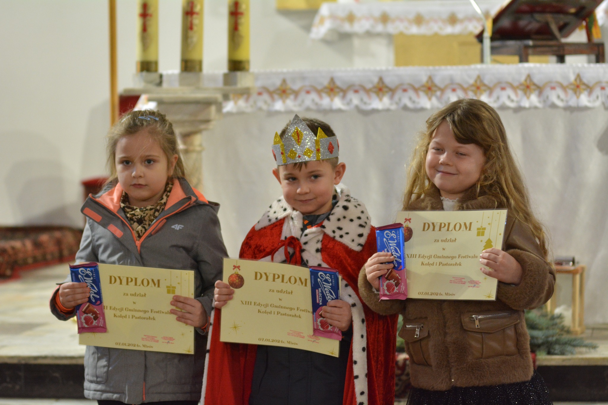 Podczas festiwalu swój talent wokalny i artystyczny zaprezentowali uczniowie z trzech szkół znajdujących się w naszej gminie oraz dziecięcy Zespół Folklorystyczny „Radosne Nutki”. W sumie można było zobaczyć występy kilkudziecięciu młodych artystów, którzy podzieleni zostali na trzy kategorie: klasy ,,0”, klasy I-III oraz klasy IV – VIII. Żaden z utworów nie powtórzył się i trzeba przyznać, że w tym roku usłyszeliśmy kilka mało znanych, ale za to bardzo pięknych kolęd i pastorałek.