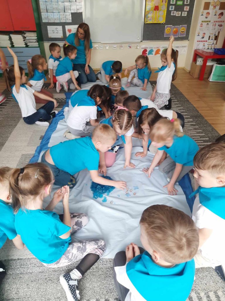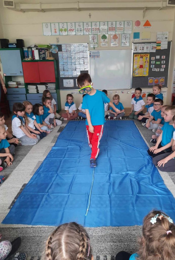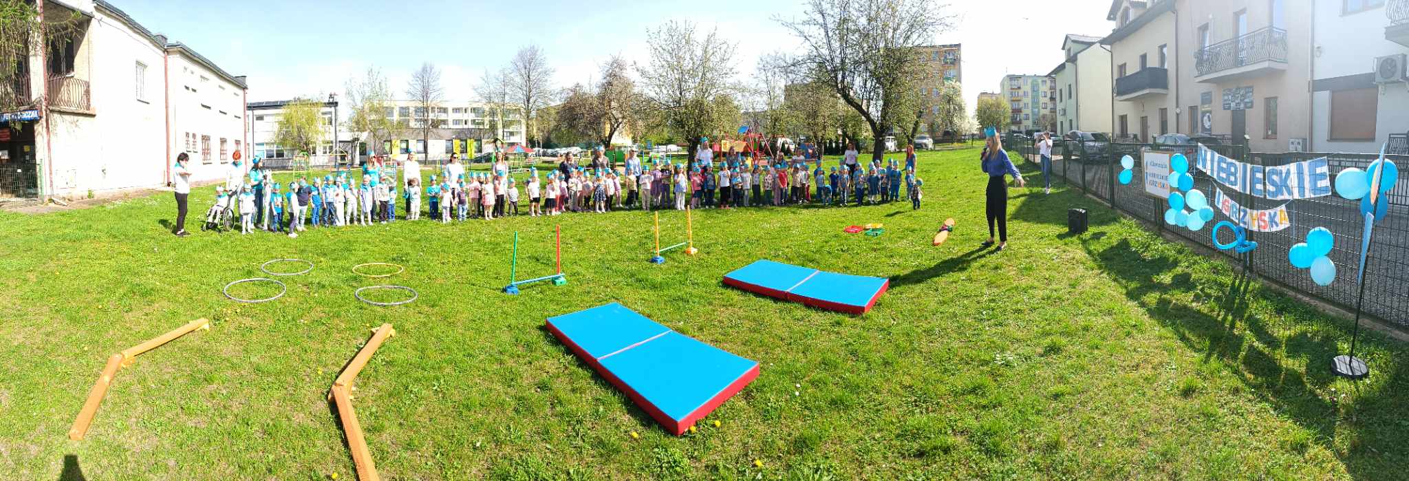 W części sportowej, zostały zorganizowane Niebieskie Igrzyska. Podczas tego wydarzenia, dzieci mogły wziąć udział w różnych konkurencjach sportowych tj. rzucanie do celu, czołganie, przeskoki czy pokonywanie przeszkód. Nasze przedszkolaki bardzo chętnie uczestniczyły w proponowanych zajęciach sportowych i czerpały z nich mnóstwo radości.