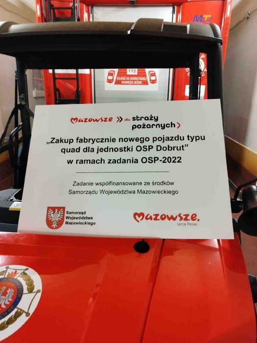 Gmina Orońsko otrzymała pomoc finansową w formie dotacji celowej z budżetu Województwa Mazowieckiego na dofinansowanie zakupu wyposażenia w postaci pojazdu typu quad dla jednostki Ochotniczej Straży Pożarnej Dobrut w ramach programu „Mazowsze dla straży pożarnych – 2022”.
