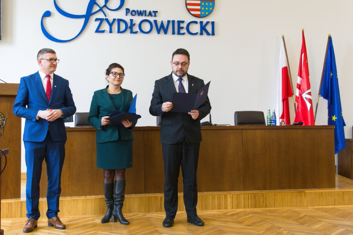 Podczas spotkania Starosta Szydłowiecki Robert Górlicki wraz z Wicestarostą Anitą Gołosz wręczyli nowo powołanym członkom Rady akty powołania.