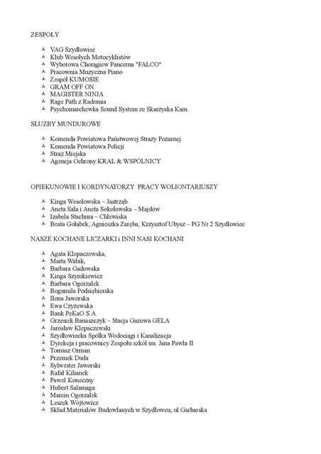 Na koniec małe podsumowanie tegorocznego szydłowieckiego finału. Współtworzyło go przeszło 200 osób. Jeszcze raz podkreślono, że każdy do kogo zwrócono się o pomoc chętnie nią służył. WOŚP zaangażowała do wspólnego działania ludzi z różnych środowisk. W tym roku pracowało 115 wolontariuszy, którzy kwestowali w Szydłowcu, Majdowie, Chlewiskach i Jastrzębiu. Udało się zebrać 34 183, 52 zł a przez 20 lat wspólnego grania mieszkańcy Szydłowca i okolic zasili konto Orkiestry ponad 250 tysiącami zł, na zgromadzenie których kwestowało ponad 2 100 wolontariuszy.