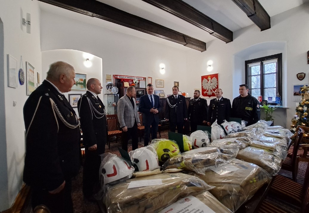 W ekwipunku strażackim znalazły się m.in. ubrania specjalne, hełmy oraz kominiarki strażackie.