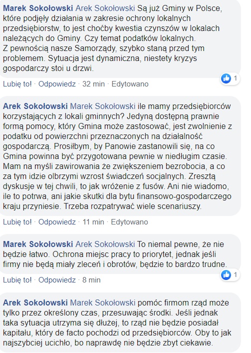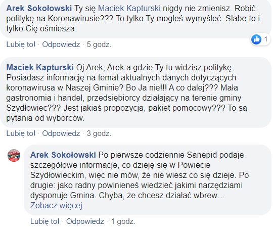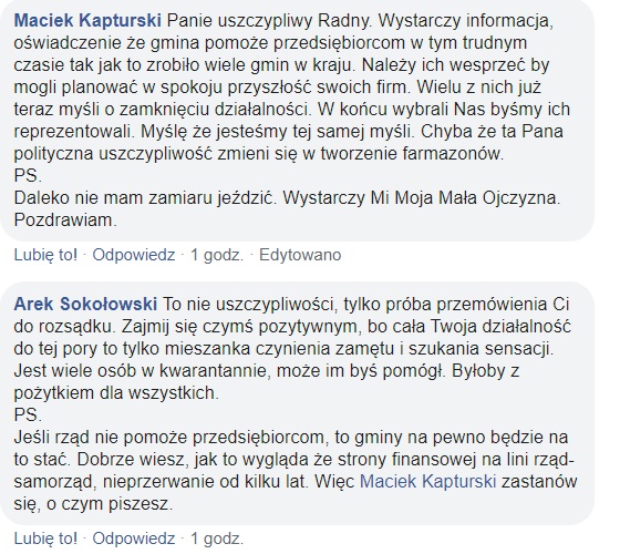 Pod jego postem wywiązała się słowna utarczka, pomiędzy radnym Kapturskim, a jego kolegą z rady, radnym Arkadiuszem Sokołowskim. Do dyskusji dołączył się również radny powiatowy Marek Sokołowski.
