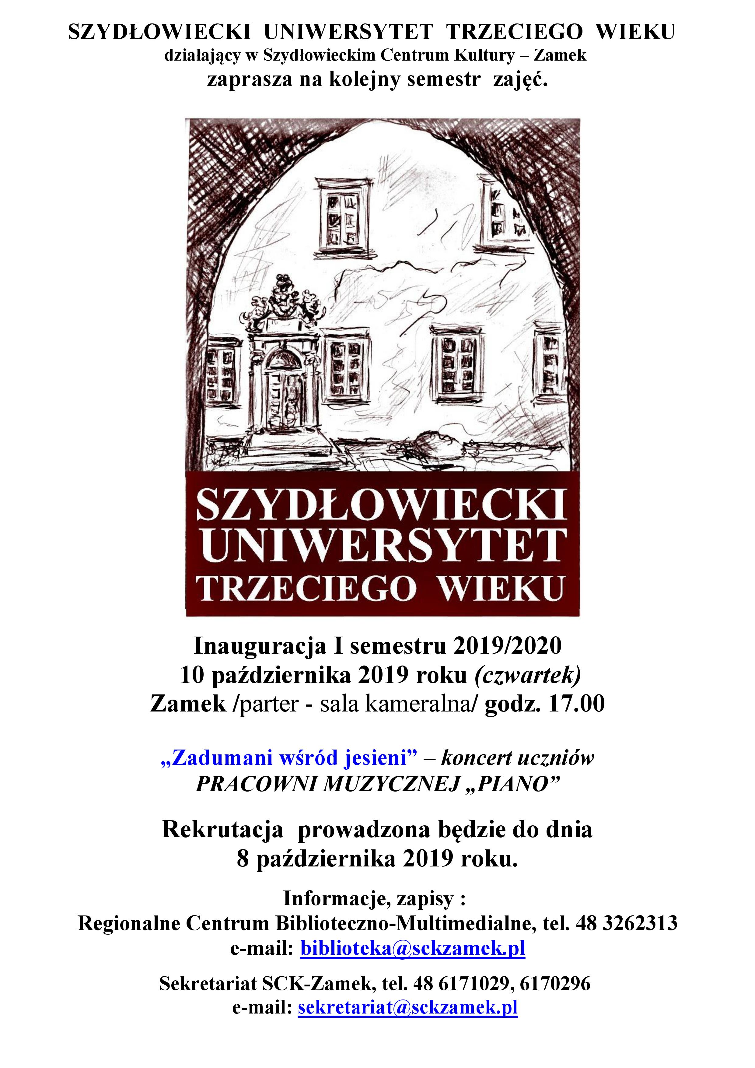 Inauguracja odbędzie się w Szydłowieckim Zamku dn. 10 października o godz. 17:00. Rok akademicki rozpoczniemy koncertem „Zadumani wśród jesieni” w którym wystąpią uczniowie Pracowni Muzycznej „Piano”.