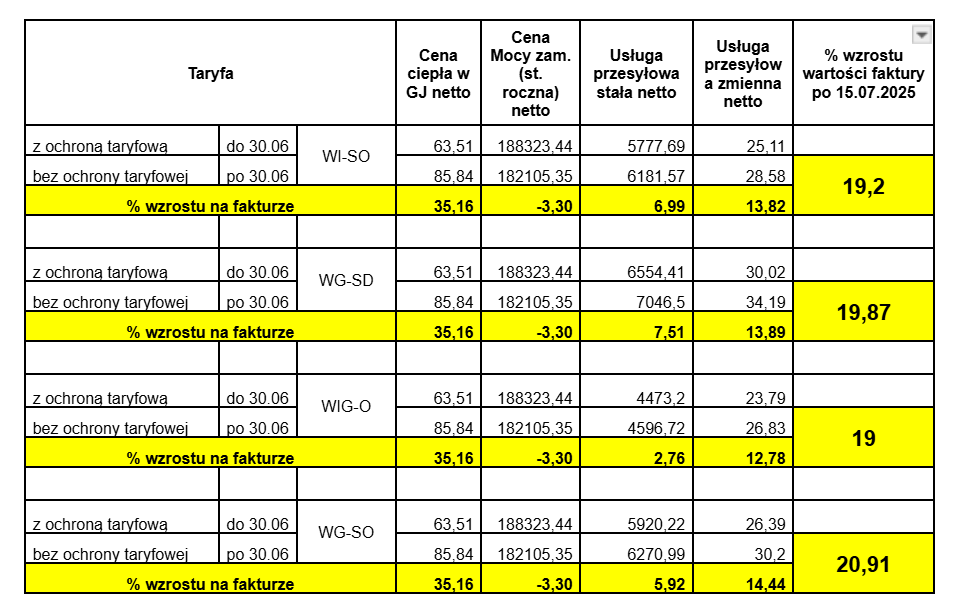Poniżej prezentujemy szczegółową analizę tabelaryczną dotyczącą wzrostu kosztów ogrzewania, co będzie miało odzwierciedlenie na fakturach wystawianych przez Ciepłownie Miejską w Szydłowcu po 15.07.2025 r.
