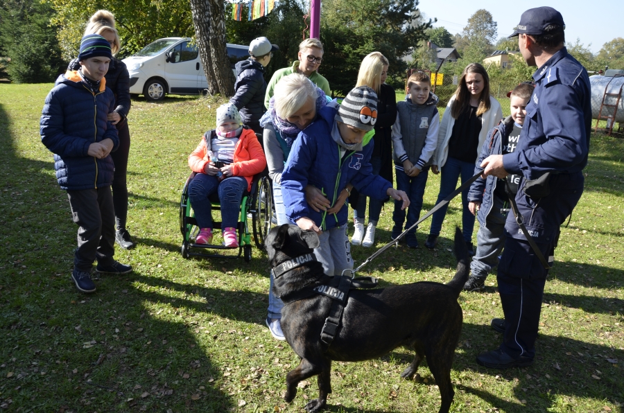 Policjanci z Zespołu Profilaktyki Społecznej Nieletnich i Patologii szydłowieckiej Policji wraz ze strażakami przeprowadzili praktyczną lekcję przybliżającą pracę policjantów i strażaków dla uczniów Szkoły Podstawowej Specjalnej w Śmiłowie. Uczniowie z wielkim zadowoleniem oglądali zaprezentowany sprzęt oraz pokaz tresury policyjnego psa.