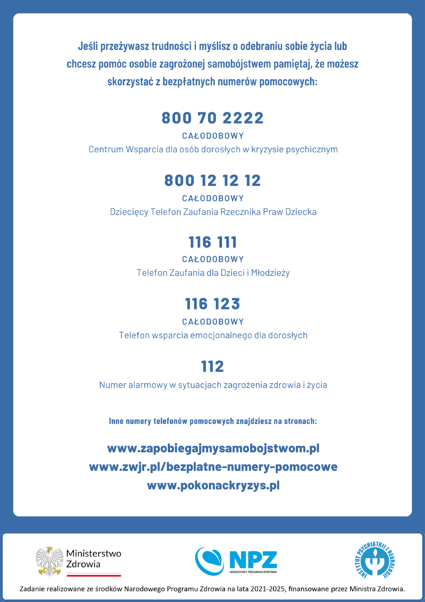 Policja podkreśla, że odpowiednie wsparcie psychologiczne odgrywa kluczową rolę w takich sytuacjach. Każdy, kto znajduje się w kryzysie emocjonalnym, może i powinien szukać pomocy – nie trzeba być z tym samemu.