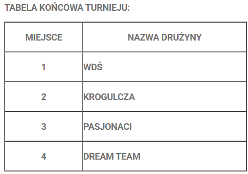 Do udziału w zawodach zgłosiło się cztery zespoły, które rozgrywały swoje mecze systemem „każdy z każdym” do dwóch wygranych setów, a na podstawie wszystkich wyników utworzono tabelę z końcową klasyfikacją Turnieju. Podczas turnieju było sporo wysiłku, mnóstwo rywalizacji, wspaniałych akcji i jeszcze więcej radości z gry oraz dobrej zabawy. Wszyscy zawodnicy przestrzegali zasad fair – play. Rywalizację wygrała drużyna o nazwie „WDŚ”. Sędzią głównym turnieju była Pani Karolina Chylak ze Świętokrzyskiego Związku Piłki Siatkowej.