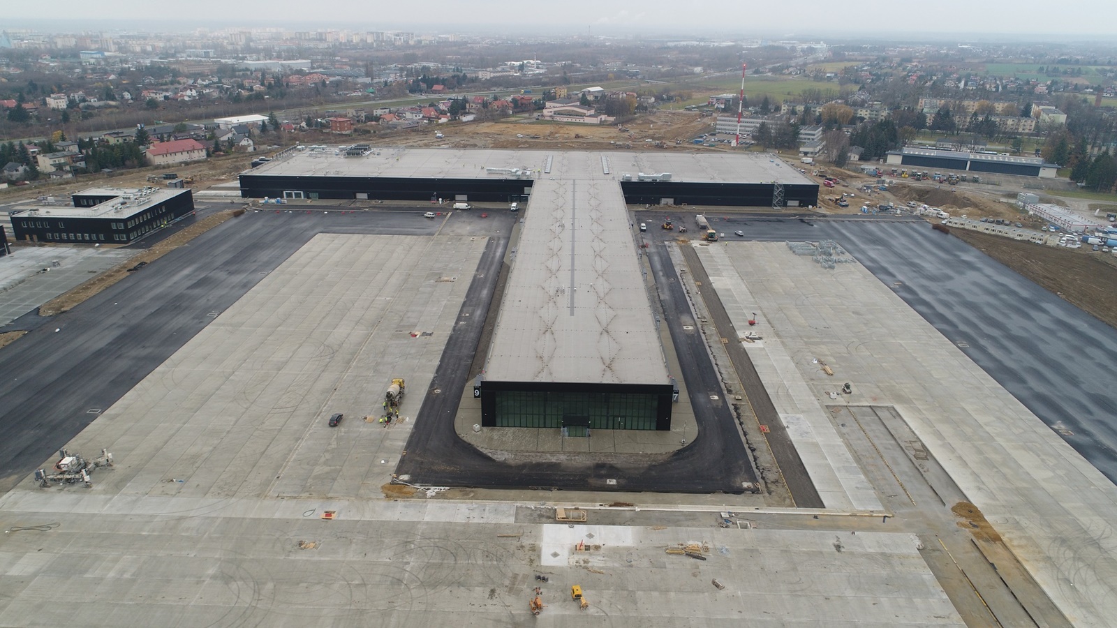 Równolegle ekipy budowlane i montażowe uwijają się przy wieży kontroli lotów i strażnicy Lotniskowej Straży Pożarnej, które powstają po południowej stronie drogi startowej. Postawiono też maszt telekomunikacyjny TETRA. 50-metrowa konstrukcja strunowo-betonowa będzie służyła do wewnętrznej łączności lotniskowej. Maszt wybudowany na terenie terminala jest jednym z najwyższych obiektów w Radomiu.