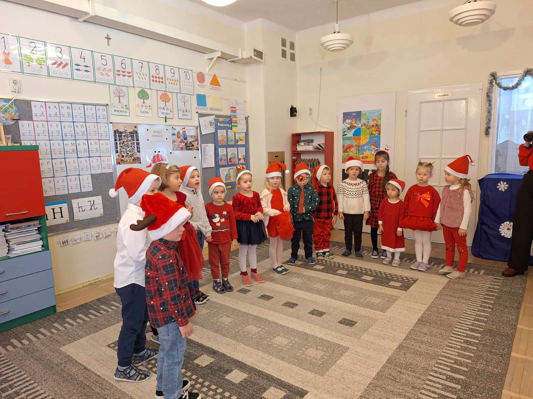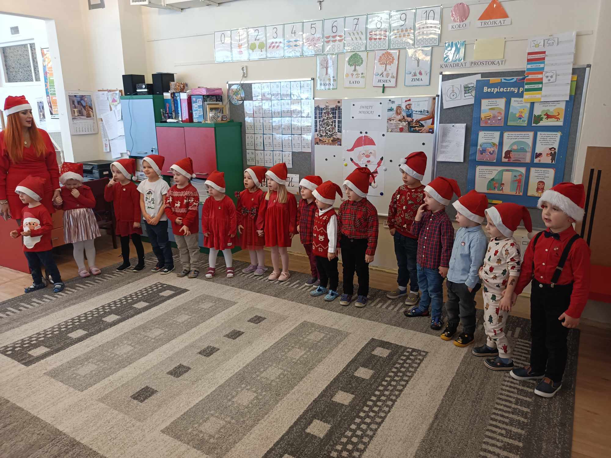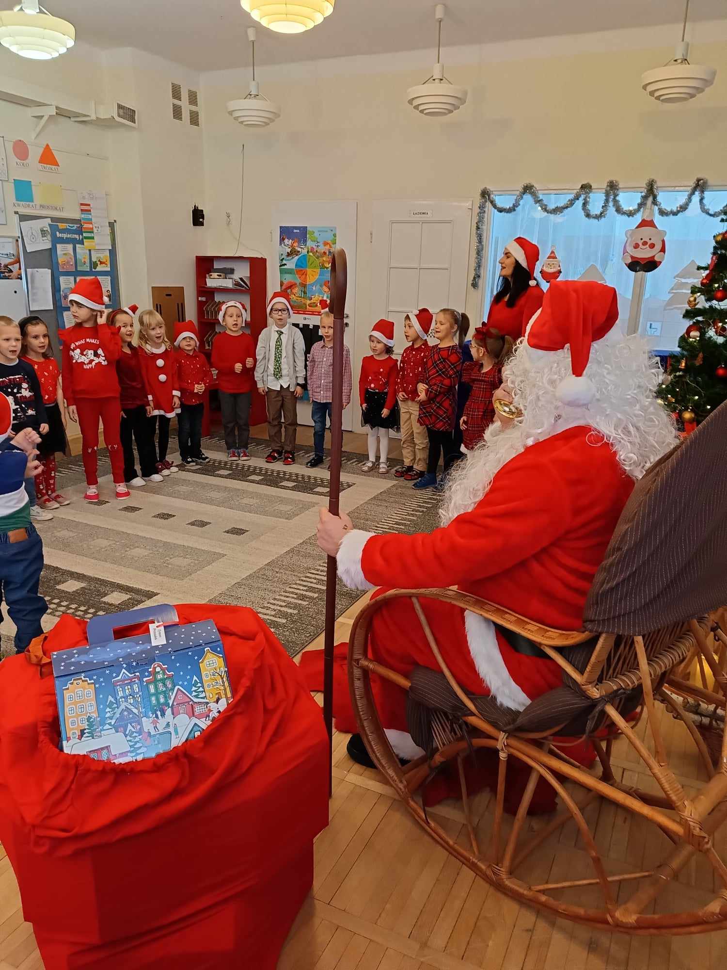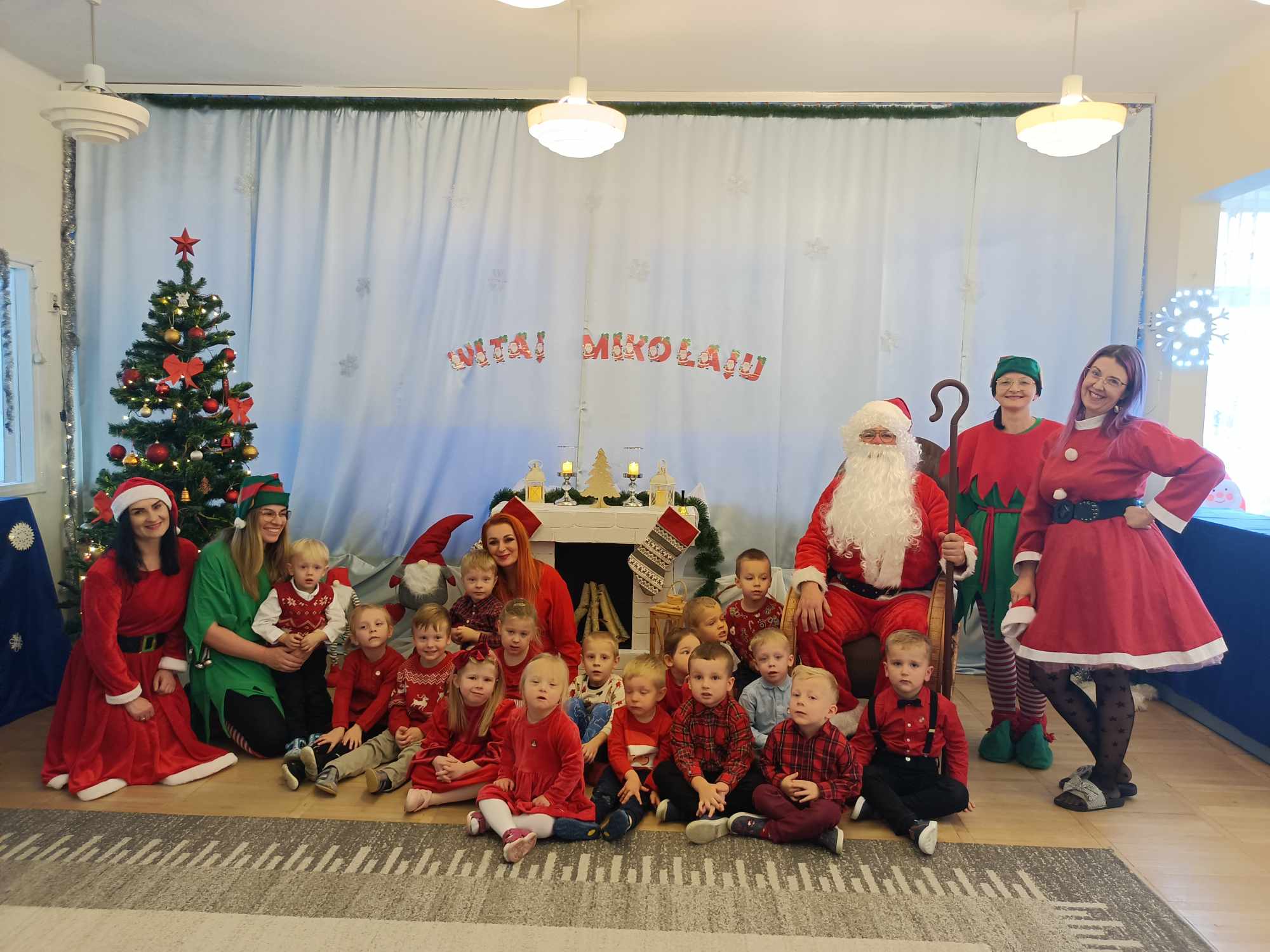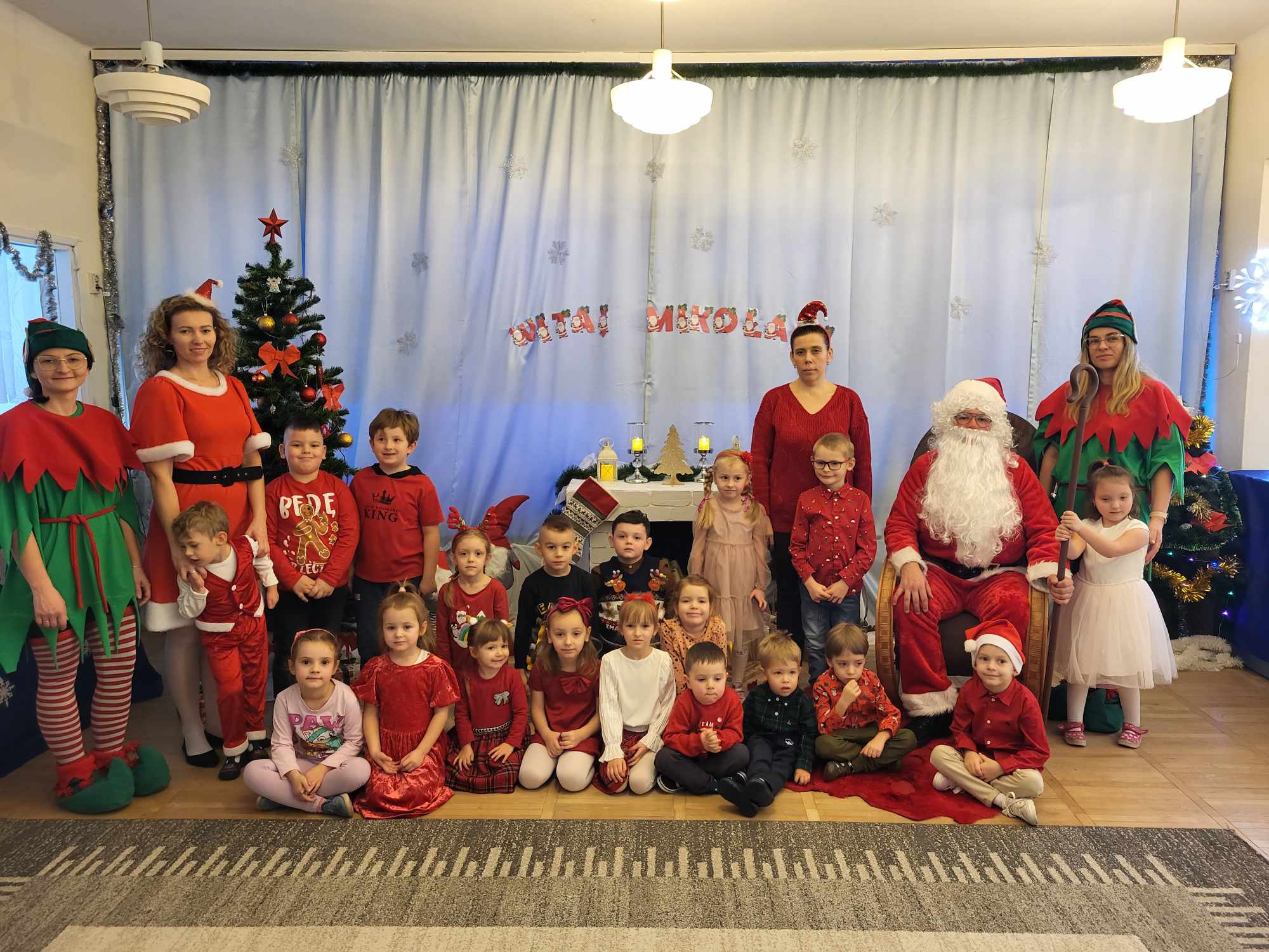 Pojawił się tuż po śniadaniu. Swoją obecność oznajmił dźwiękiem dzwonków. Dzieci z poszczególnych grup długo przygotowywały się do wizyty tak wspaniałego gościa. Zaśpiewały mu piosenkę przygotowaną specjalnie na tę wyjątkową okazję. Mikołaj z pomocą Elfów wszystkich obdarował podarunkami.