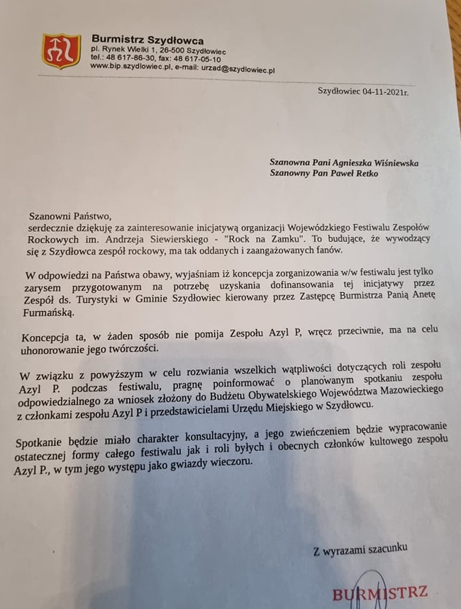 TUTAJ załączamy list fanów Azylu P., który otrzymał burmistrz Szydłowca.