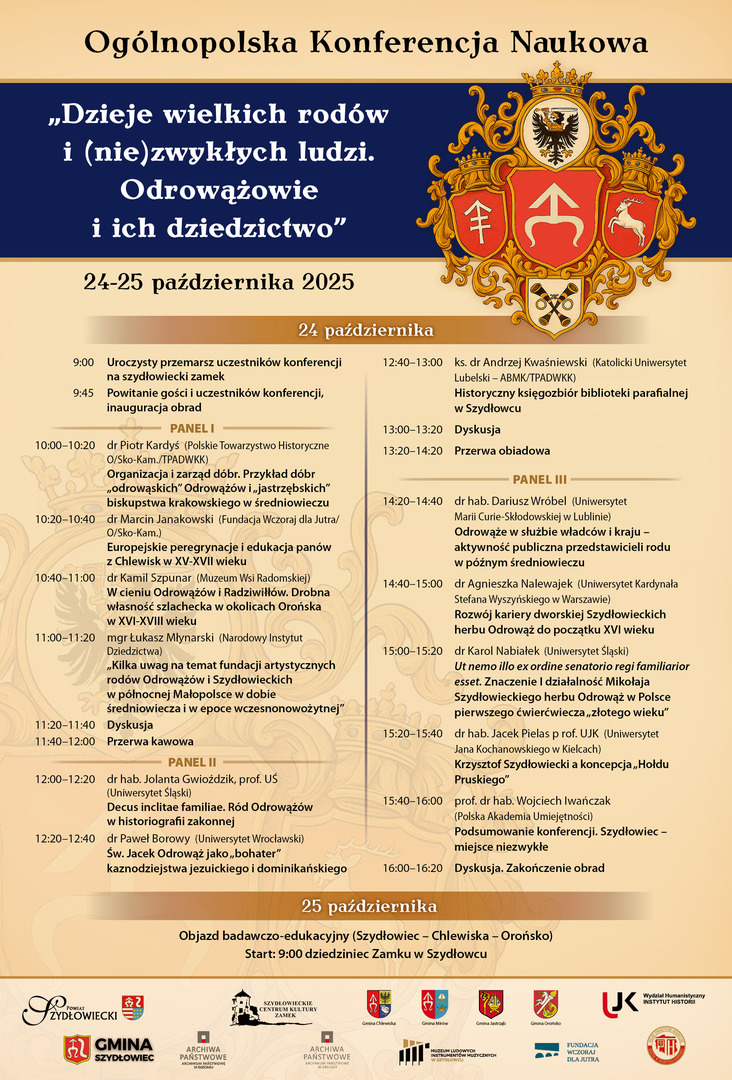 Wszystkich Państwa zainteresowanych spuścizną historyczną Powiatu Szydłowieckiego zapraszamy do wysłuchania Ogólnopolskiej Konferencji Naukowej  zatytułowanej „Dzieje wielkich rodów i (nie)zwykłych ludzi. Odrowążowie i ich dziedzictwo”, która będzie miała miejsce w na zamku Szydłowieckich w piątek 24 października br.