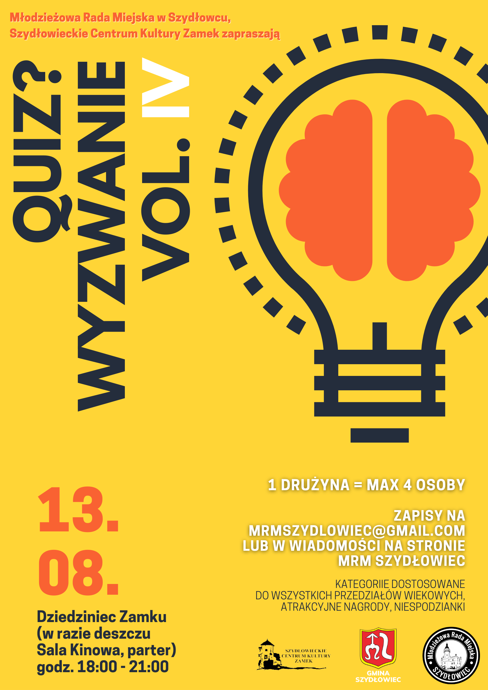 Młodzieżowa Rada Miejska w Szydłowcu oraz Szydłowieckie Centrum Kultury „Zamek” zapraszają na już czwartą edycję zabawy „Quiz? Wyzwanie” w Szydłowcu.