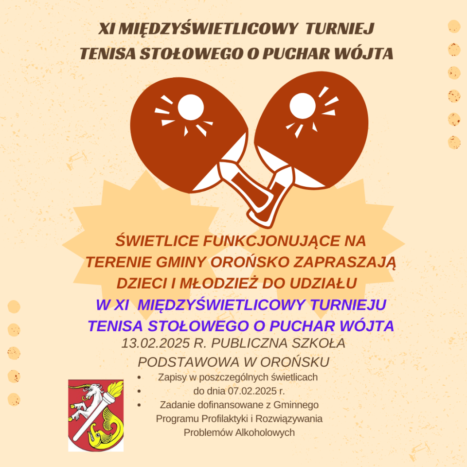 Świetlice funkcjonujące na terenie Gminy Orońsko zapraszają dzieci i młodzież do udziału w XI Międzyświetlicowym Turnieju Tenisa Stołowego o Puchar Wójta Gminy Orońsko.