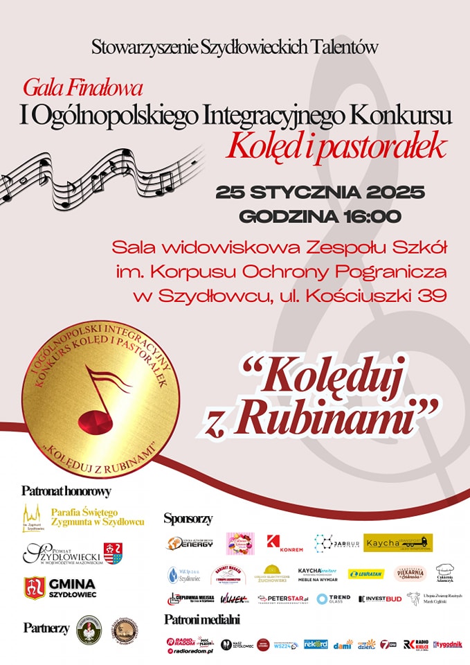 Zespół Szydłowieckie Rubiny zapraszają na uroczystą Galę Finałową I Ogólnopolskiego Integracyjnego Konkursu Kolęd i Pastorałek w Szydłowcu „Kolęduj z Rubinami”.